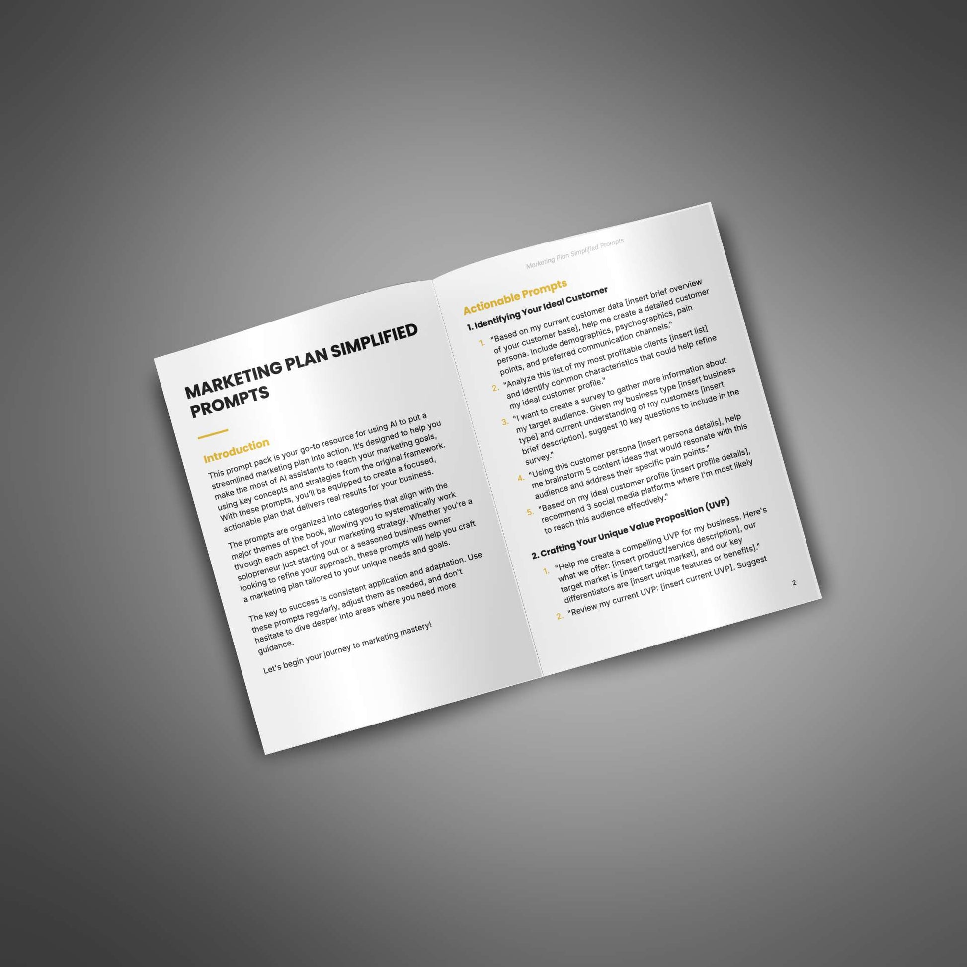 Marketing Plan Simplified gives you the structure professionals use, without the $5,000+ consultant price tag. This collection of carefully crafted AI prompts walks you through creating a complete marketing strategy - one simple question at a time.
