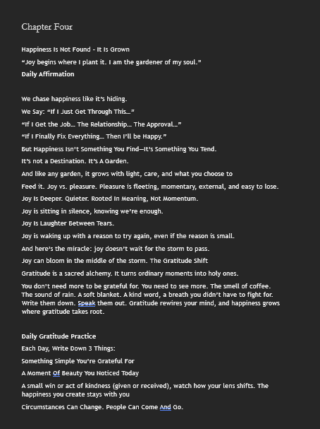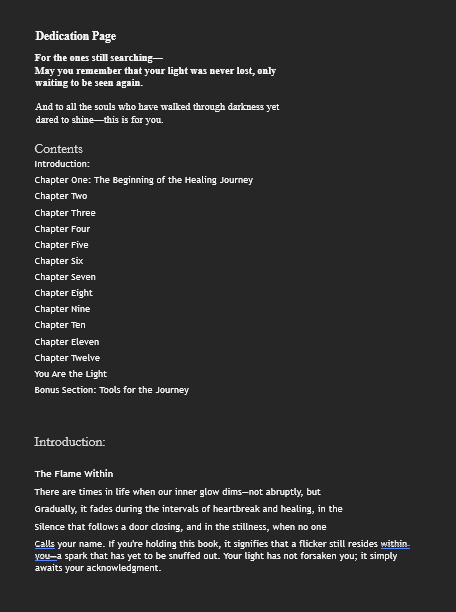 This book is not about perfection. It is about showing up—fragile, hopeful, imperfect, and willing. Each chapter is a doorway back to yourself, to the divine spark that has always lived within you.