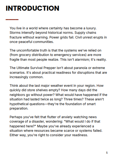 The Ultimate Survival Prepper is your all-in-one field manual for building the mindset, skills, and systems that keep you and your loved ones safe when the unexpected happens. Whether it’s a power outage, natural disaster, civil unrest, or being forced into the wild, this guide shows you exactly how to prepare, step by step.