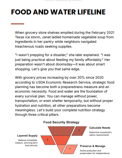 Food & Water Lifeline – How to calculate your true needs, build a 3-tier food system, preserve food for decades, and secure clean drinking water.